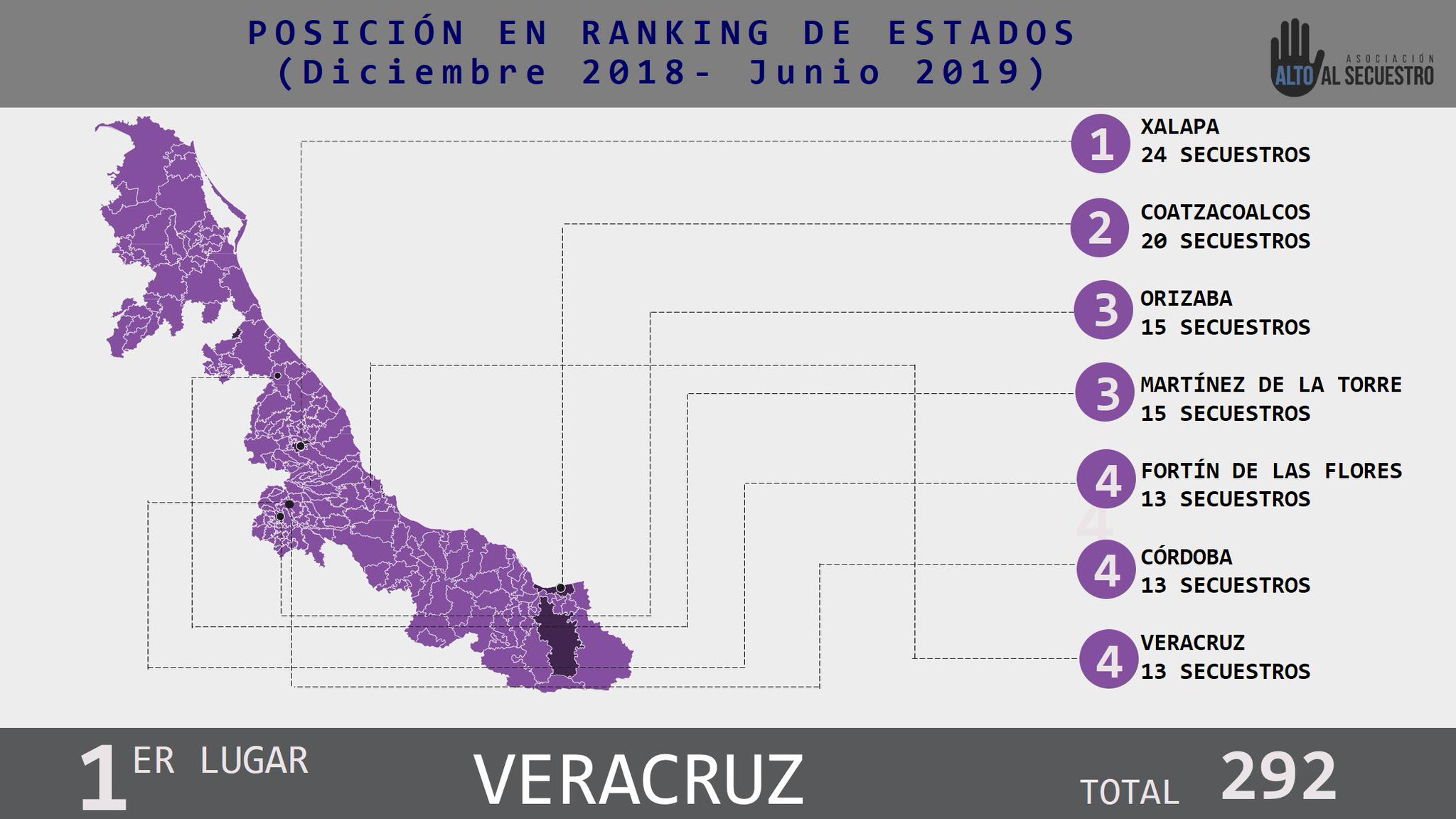 Por alcaldías o municipios en lo que va de la presente administración, de diciembre de 2018 a junio de 2019, es Xalapa la localidad con más secuestros denunciados con un total de 24 casos, seguido de Coatzacoalcos con 20, ambos en Veracruz, y Naucalpan , en el Estado de México, con 18 denuncias acumuladas.