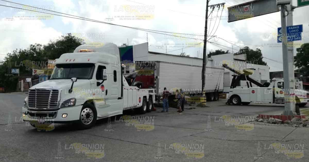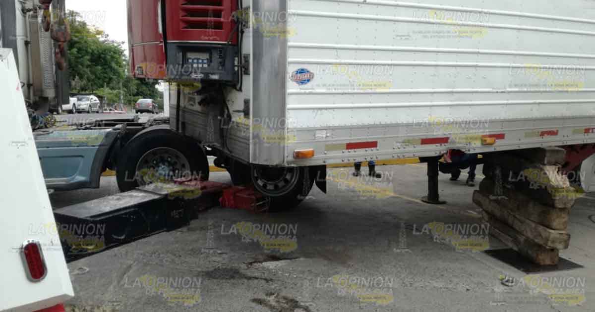 Tuxpan Ver. – Operador de un tráiler que pretendía acomodarse de reversa en el área de descarga de un establecimiento comercial ubicado en la colonia La Rivera, de esta ciudad no calculó bien la maniobra y provocó que el remolque se zafara del “dolly” y la caja quedara recargada en un poste de la CFE y le provocara daños a una base antichoques.