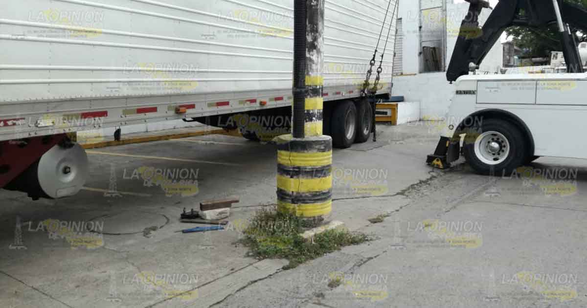 Reportes indican que estos hechos ocurrieron la mañana de este sábado en el área de descarga del establecimiento comercial Carne Mart ubicada en el cruce del bulevar Independencia y 15 de Septiembre, de la colonia La Rivera, de esta ciudad.El tráiler según trascendió transportaba productos perecederos y el operador quien se negó a proporcionar datos acerca de su nombre echaba de reversa para acomodarse en el área de descarga del establecimiento pero no calculó bien la maniobra y al no tomar en cuenta un desnivel provocó que la caja estuviera a punto de volcar y quedó recargada en el poste de concreto.