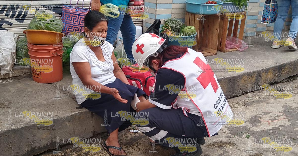 Papantla, Ver.- Comerciante ambulante sufrió una dramática caída de su propia altura, lesionándose una de sus extremidades inferiores, por lo que fue socorrida por paramédicos de la benemérita Cruz Roja Mexicana, quienes le brindaron los primeros auxilios, aunque se negó a ser llevada al nosocomio.