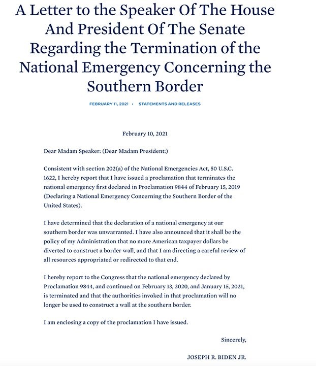 “He determinado que la declaración de emergencia nacional en nuestra frontera sur no estaba justificada. También he anunciado que será política de mi administración que no se desvíen más dólares de los contribuyentes estadounidenses para construir un muro fronterizo”, indicó.