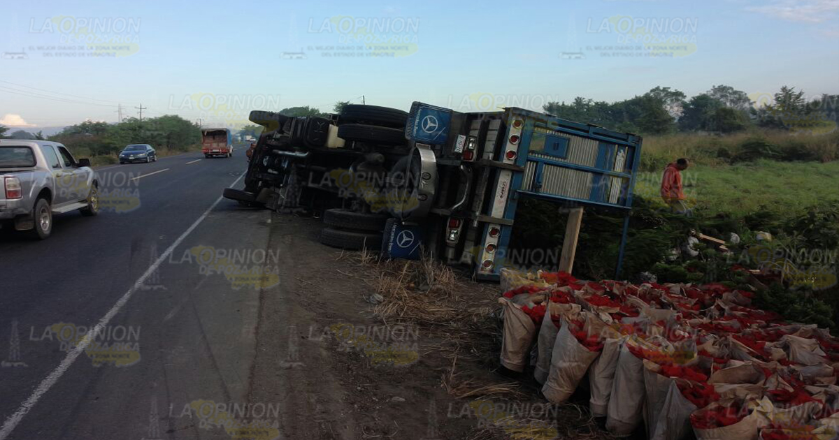 Álamo, Ver.- Un camión torton, cargado con arbolitos y plantas navideñas, y un tráiler que transportaba línea blanca, volcaron la mañana de este lunes sobre la carretera federal Tihuatlán-Álamo-Alazán, en diferentes momentos y lugares; afortunadamente, el saldo fue sólo de daños materiales.