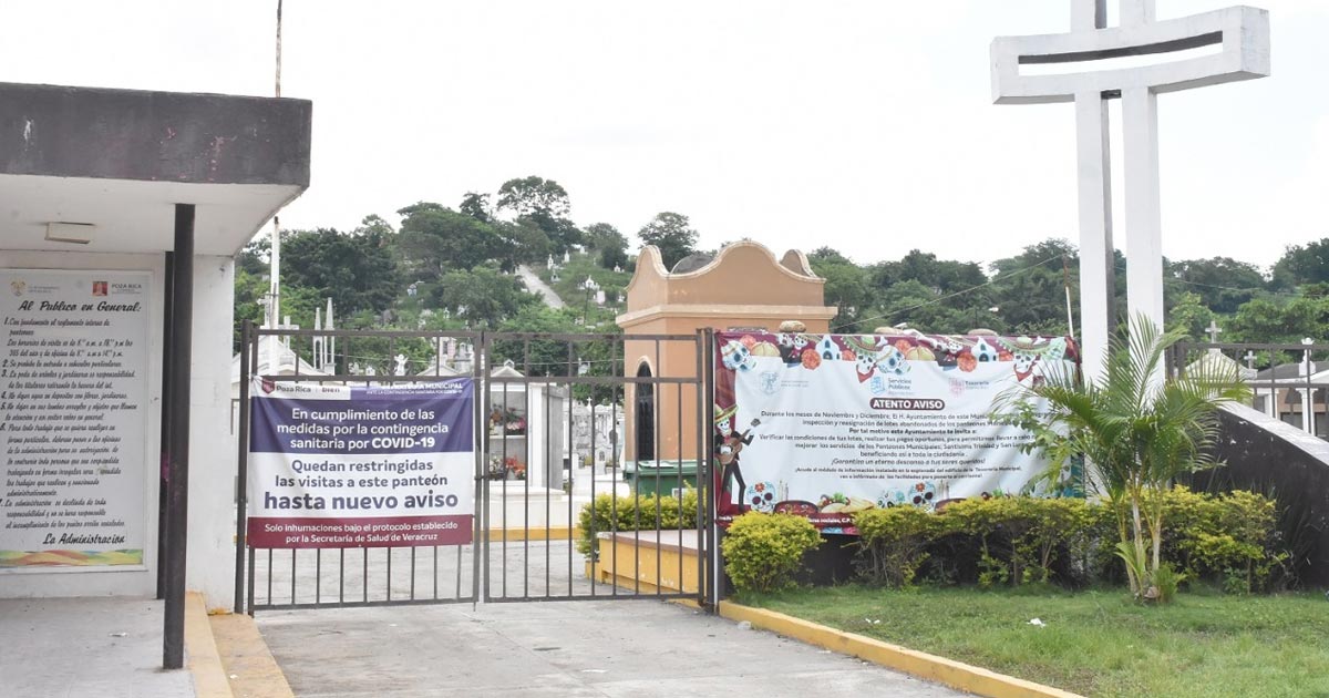 Poza Rica, Ver.- El Gobierno Municipal de Poza Rica informa a la población en general que por motivo de la Contingencia Sanitaria provocada por el Virus Sars-Cov-2 (COVID-19), los días 1 y 2 de noviembre, permanecerá cerrado el acceso a los Panteones Municipales y particulares de la ciudad, con el fin de evitar aglomeraciones y con ello proteger la salud de la población, ante esta condición de riesgo.