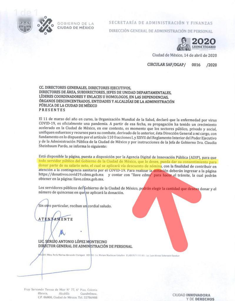 En un oficio firmado por el Director General de Administración de Personal de la Ciudad de México, informa que dicha donación se aplicará vía descuento de nómina, para contribuir en la atención a la contingencia sanitaria por el covid-19.