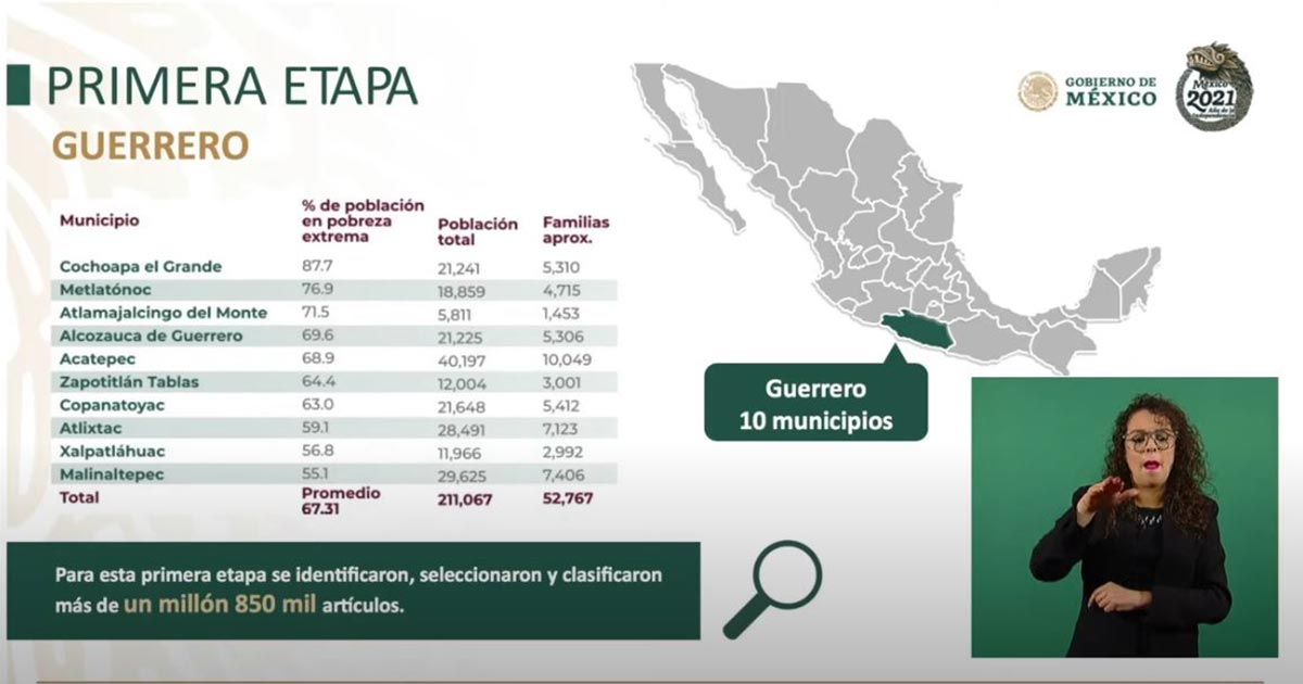 La secretaria de Seguridad Rosa Icela Rodríguez detalló que la primera etapa del Tianguis del Bienestar para Devolverle al Pueblo lo Robado será en 10 municipios de Guerrero: Cochoapa el Grande, Metlatónoc, Atlamajalcingo del Monte, Atlixtac, Alcozauca, Acatepec, Zapotitlán, Copanatoyac, Xalpatláhuac y Manilaltepec.