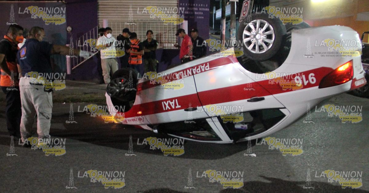 Papantla, Ver.- Aparatosa volcadura de un taxi se registró durante la madrugada de este viernes, dejando como saldo daños materiales por varios miles de pesos, personal de tránsito y seguridad vial tomó conocimiento de los hechos, el conductor salió ileso.
