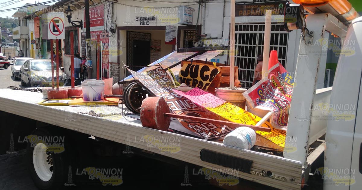 Papantla, Ver. – En un operativo realizado en el centro de esta ciudad por autoridades responsables de la vialidad, fueron recogidos varios objetos que se encontraban colocados a las afueras de los negocios, mismos que obstruían la vialidad y representaban un peligro para los transeúntes.
