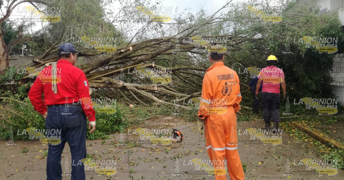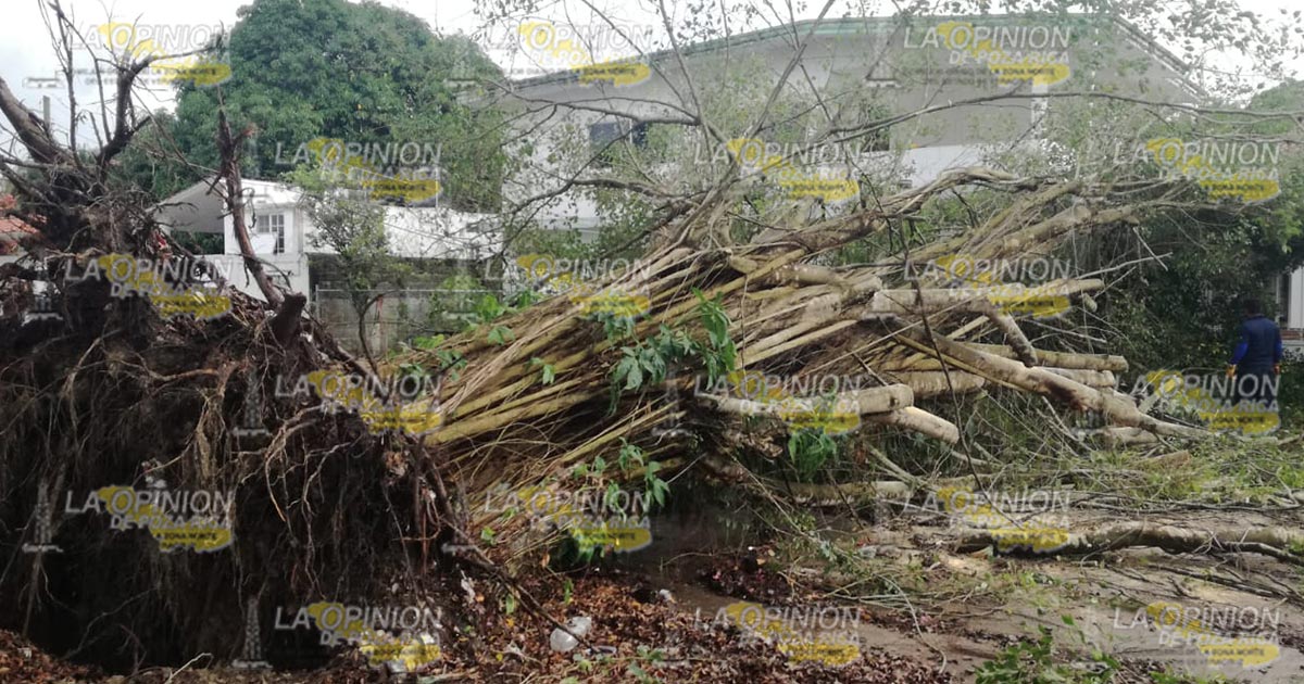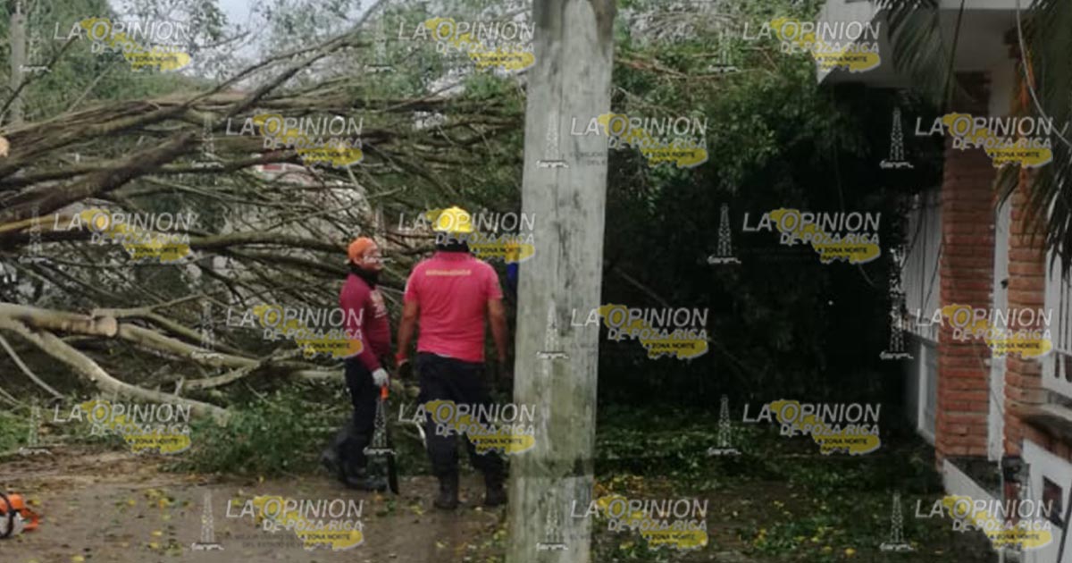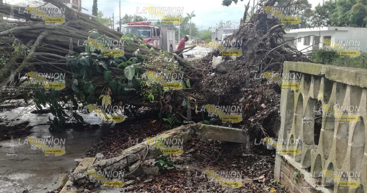 Tuxpan, Ver.- Un árbol cayó como consecuencia de la pertinaz lluvia que se ha sentido en el municipio lo que ha provocado el reblandecimiento de la tierra; bomberos confirmaron que se vieron afectados varias residencias ubicadas en esta zona.