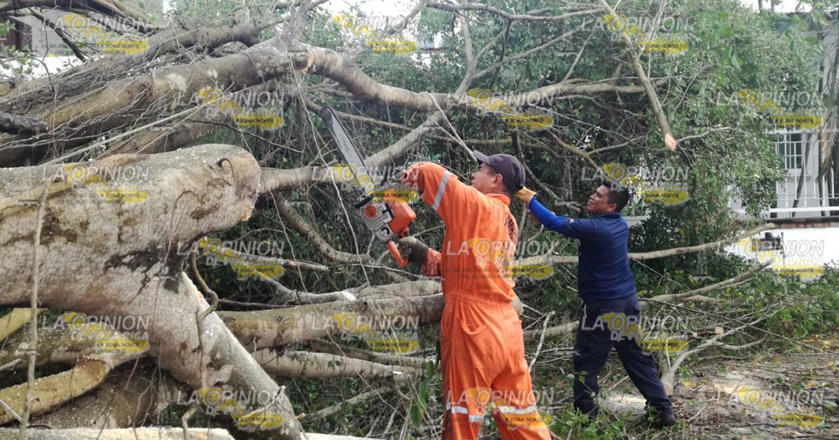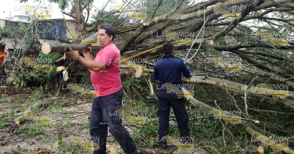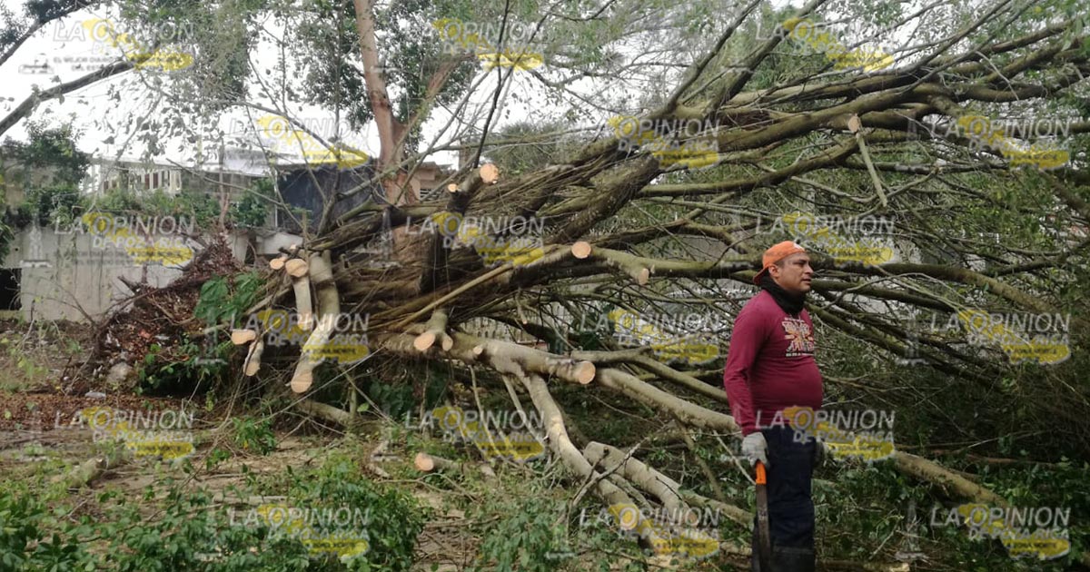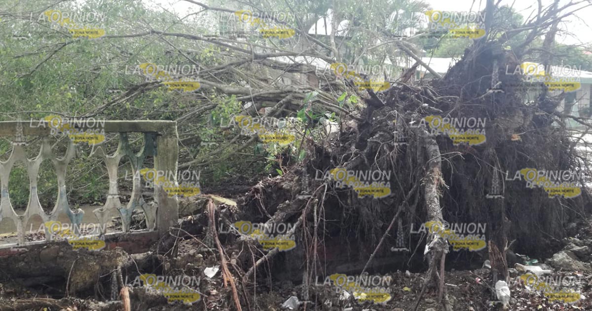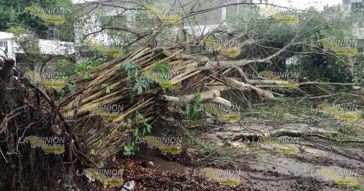Tuxpan, Ver.- Un árbol cayó como consecuencia de la pertinaz lluvia que se ha sentido en el municipio lo que ha provocado el reblandecimiento de la tierra; bomberos confirmaron que se vieron afectados varias residencias ubicadas en esta zona.