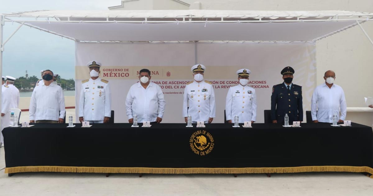 Los efectivos ascendidos recibieron sus insignias y condecoraciones durante una ceremonia simbólica realizada el viernes por la mañana en las instalaciones de la Secretaría de Marina-Armada de México, en el marco de la celebración por el CX aniversario de la Revolución Mexicana.