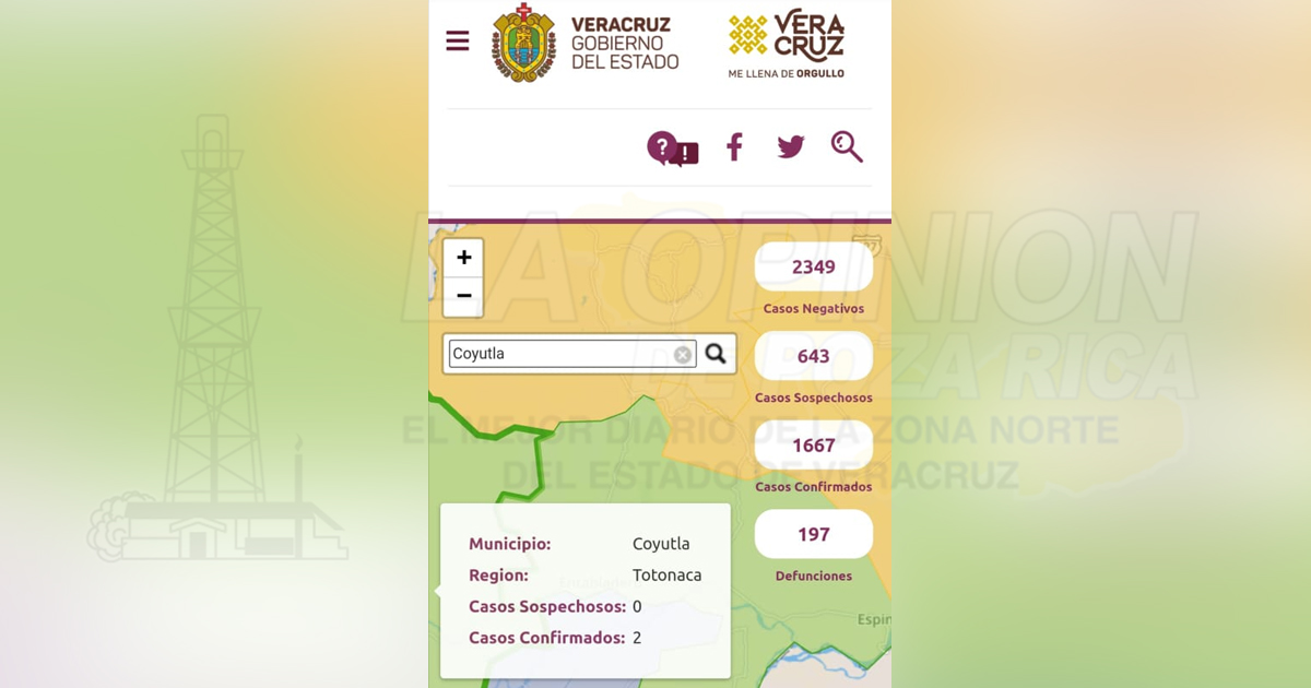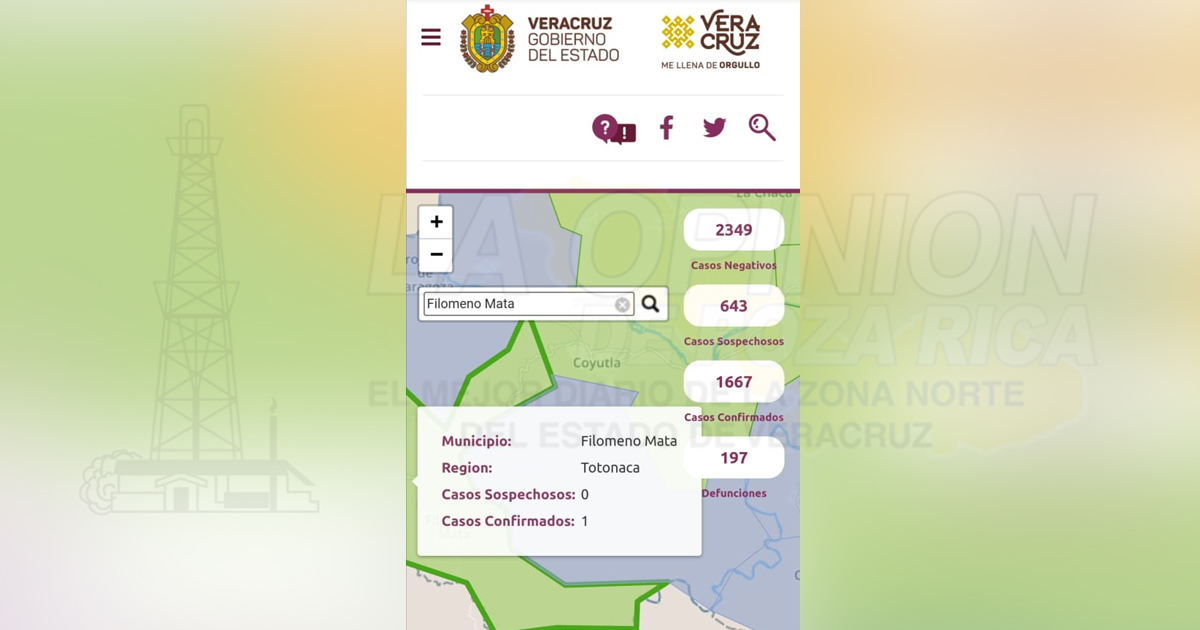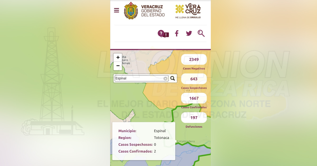 De acuerdo a la Secretaría de Salud, hay dos casos positivos de Covid-19 en el municipio de Espinal, al igual que Coyutla y Uno en Filomeno Mata, los 5 están bajo observación médica para ver la evolución de los pacientes.