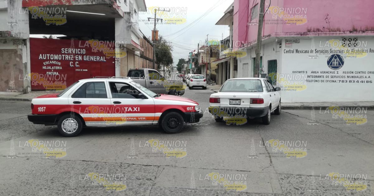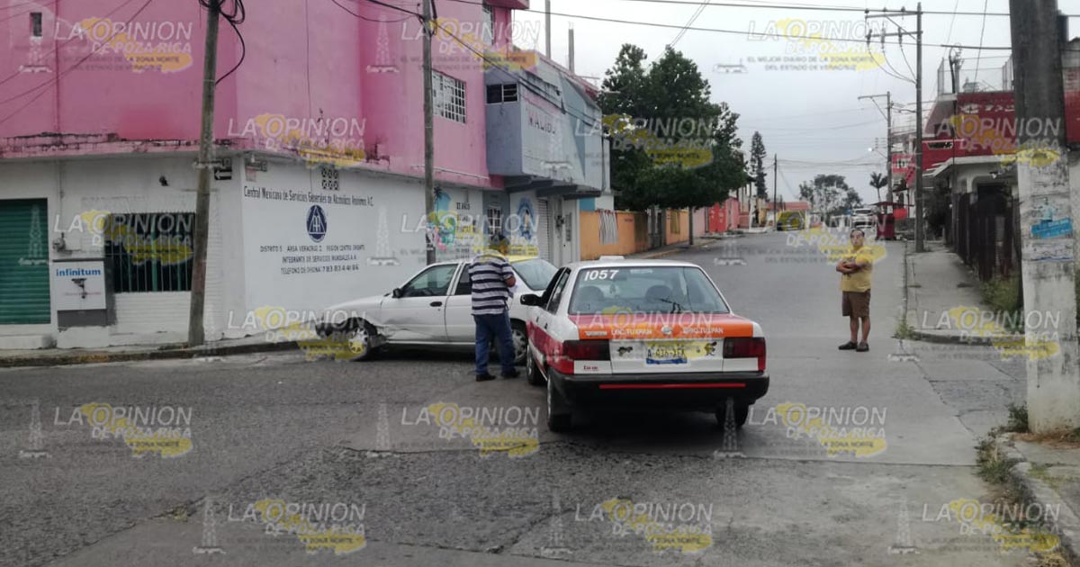 Tuxpan, Ver.- El choque de un taxi y un auto particular en un centro crucero, de esta localidad deja como saldo cuantiosos daños materiales; es de mencionar que participantes llegaron a un acuerdo y se retiraron de la zona del percance.
