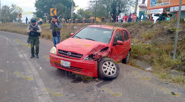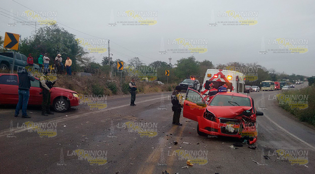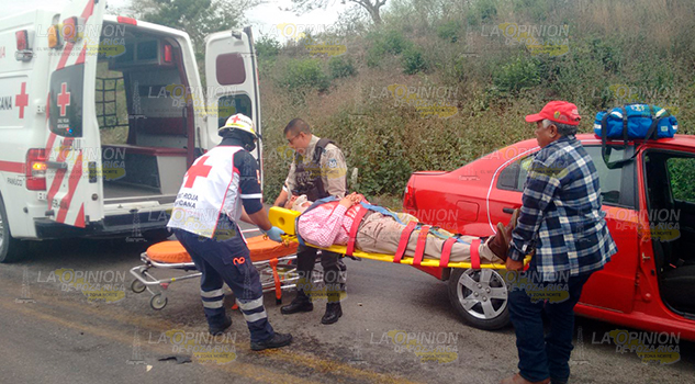 En el lugar, el automóvil Aveo, modelo 2013, con placas de Tamaulipas, propiedad de Juana Segura Aguilar, y conducido por Lázaro Martínez del Ángel, de 40 años de edad, con domicilio en Úrsulo Galván sin número de la localidad Tamós, que resultó con lesiones de consideración, mismas que fueron atendidas por Paramédicos de Cruz Roja, al invadir el carril de circulación, se proyectó de frente contra el vehículo Chevrolet Corsa, modelo 2004, con placas del Estado de Veracruz,.