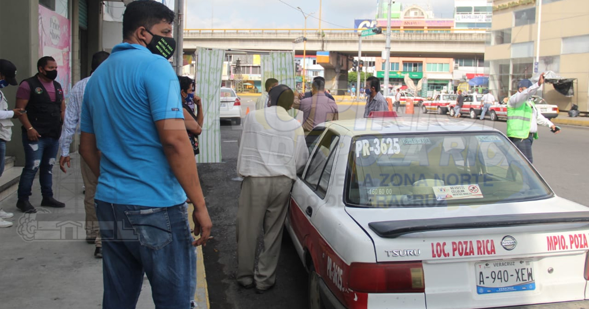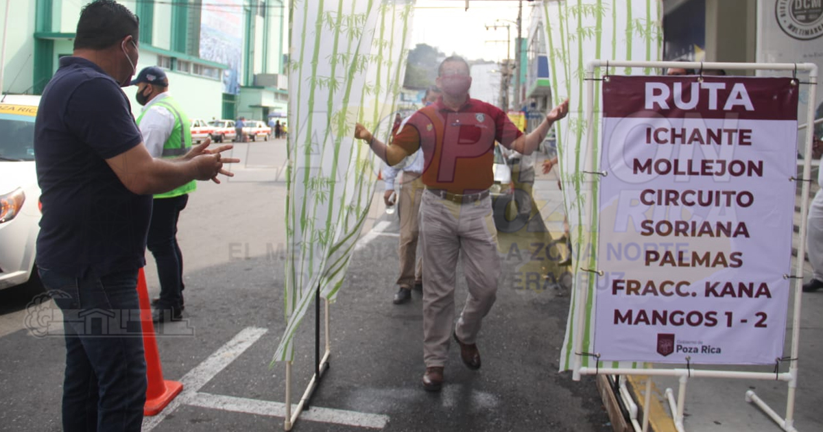 Poza Rica, Ver. – Trabajadores del volante instalaron una caseta para sanitizar a los usuarios del trasporte público en la modalidad de taxis en esta ciudad, como medida adicional para la mitigación de riesgos de nuevos contagios de Covid 19.