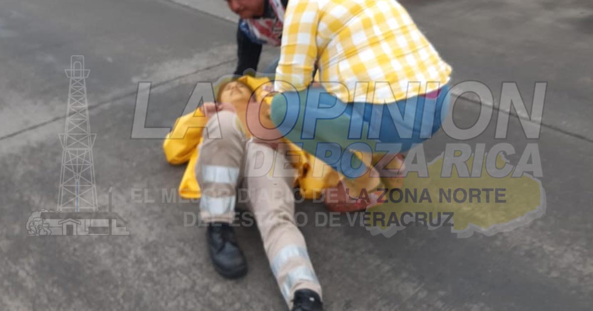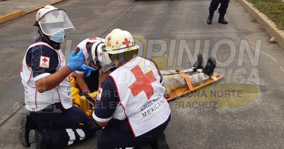 Tuxpan, Ver.- Joven mujer que manejaba una motocicleta resultó lesionada al derrapar de forma aparatosa; paramédicos de la Cruz Roja atendieron la emergencia y trasladaron a la fémina hacia la clínica del IMSS donde recibe atención médica.