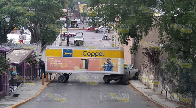 Poza Rica, Ver.- Camión a punto de volcar al intentar subir una pendiente de la calle Moctezuma de la colonia Anáhuac.