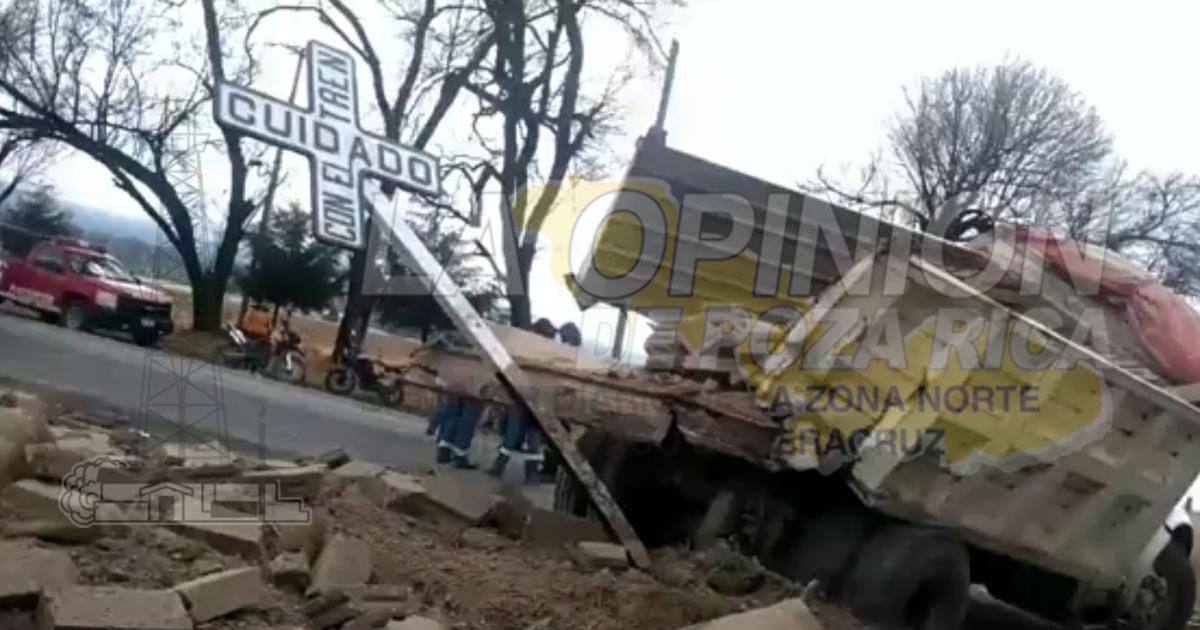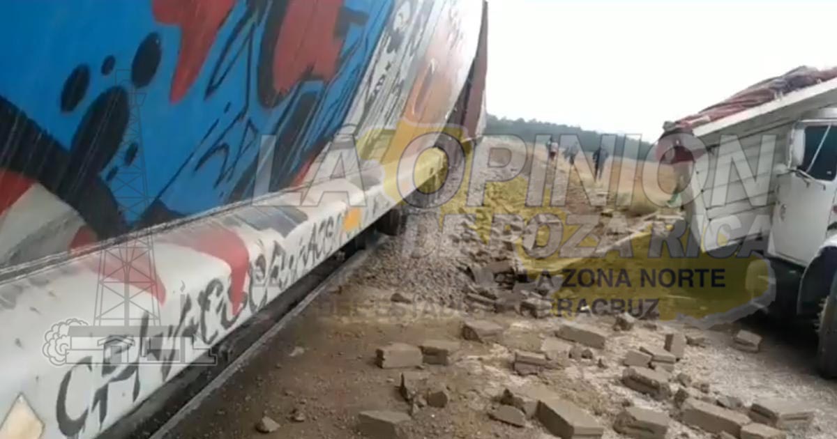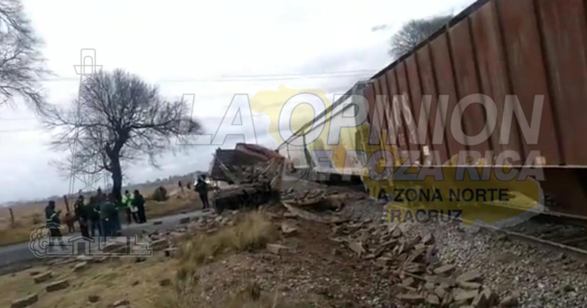 Perote, Ver. – Un chofer de un camión de volteo que transportaba block por la carretera tramo federal Perote- Villa Aldama, tras su imprudencia se le ocurrió a travesar las vías del tren, pero el ferrocarril ya se aproximaba y aun así se atrevió a cruzar y le alcanzo a pegar en la parte trasera, quedando la unidad de carga destruida.