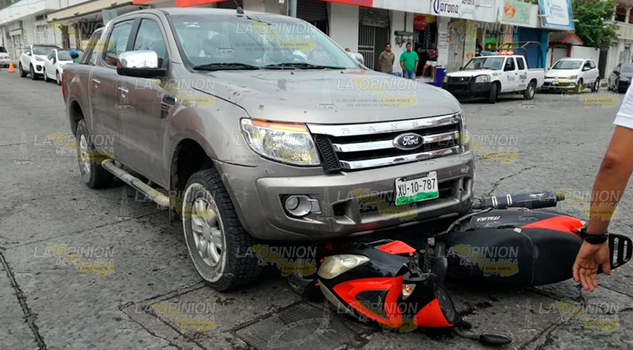 TUXPAN.- Motociclista que fue literalmente embestido por una camioneta, resultó con diversas lesiones en el cuerpo, por lo que tuvo que ser auxiliado por paramédicos de la Cruz Roja Mexicana y trasladado al Hospital Civil para su atención médica.