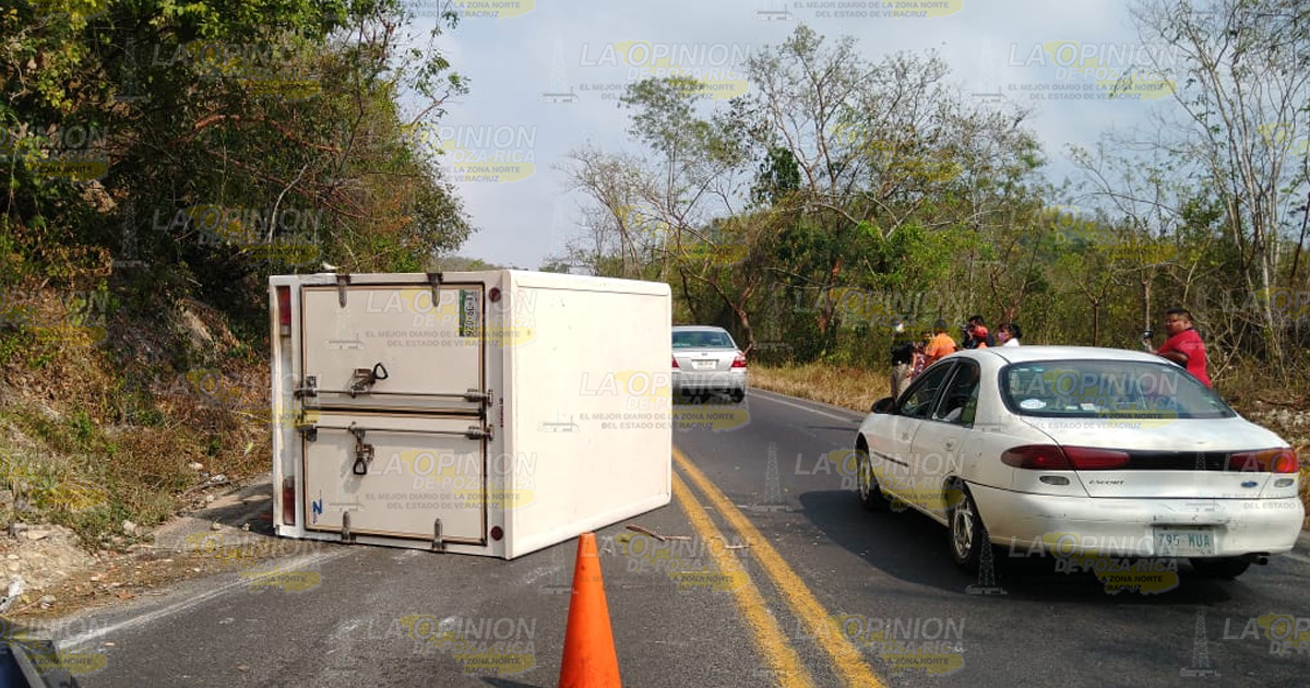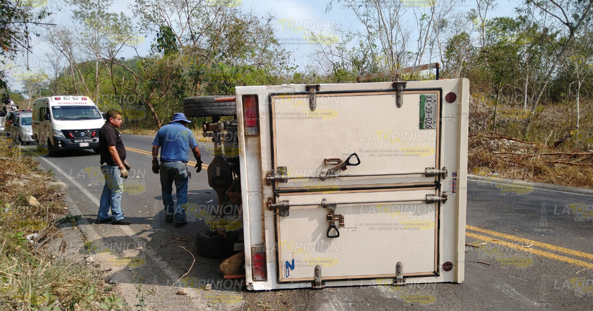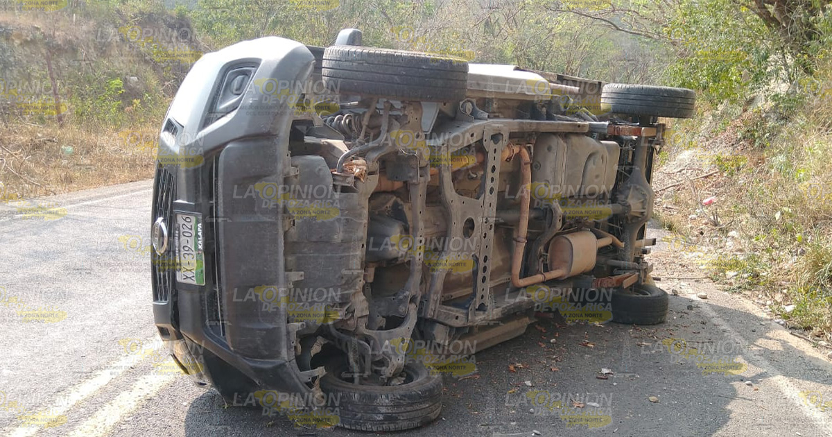 Papantla, Ver.- Aparatosa volcadura se registró la tarde de este martes sobre la carretera Papantla-Poza Rica en las inmediaciones de la comunidad Cerro Grande Escolín, donde una unidad terminó sobre uno de sus costados, lo que provocó el cierre parcial de uno de los carriles.