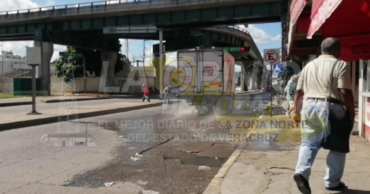 Poza Rica, Ver. – Ciudadanos y vendedores de comida, denuncian que autoridades no han atendido la petición de dar solución a la fuga de agua que, desde hace seis meses, se encuentra sobre el boulevard Lázaro Cárdenas frente al Monumento a la Madre.