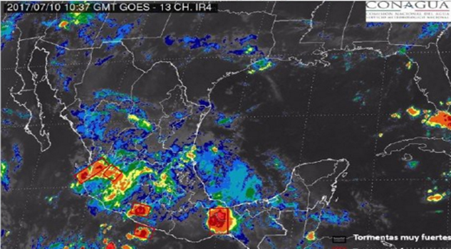 En el Pacífico Sur se registrará cielo nublado con 80 por ciento de probabilidad de tormentas puntuales intensas con actividad eléctrica en Guerrero y Oaxaca, y muy fuertes en Chiapas.