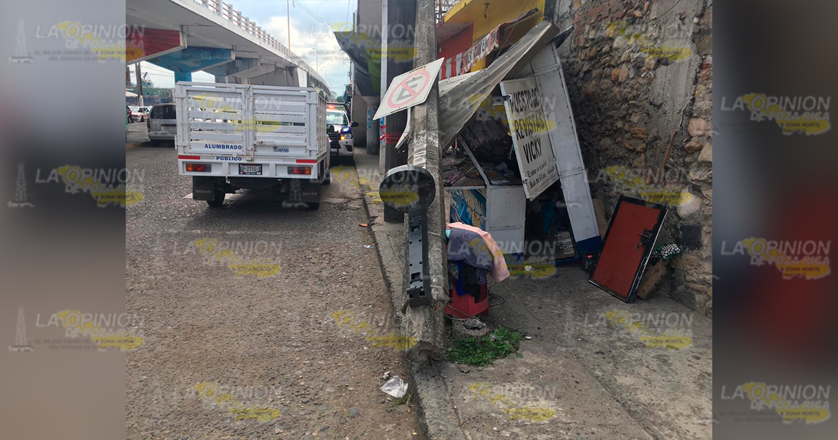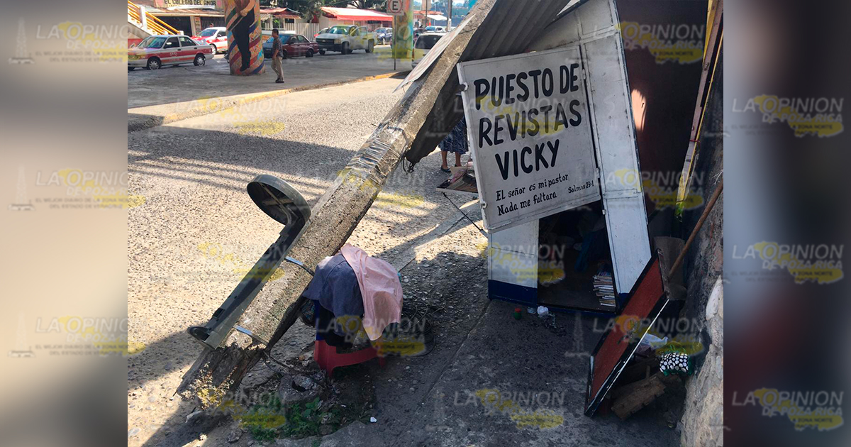 Afortunadamente el poste no cayó de lleno al puesto de revista, pues la situación se pudo tornar grave al haber lesionado a la vendedora que se encontraba en su interior, o en su caso a quienes caminaran por el transitado sitio.