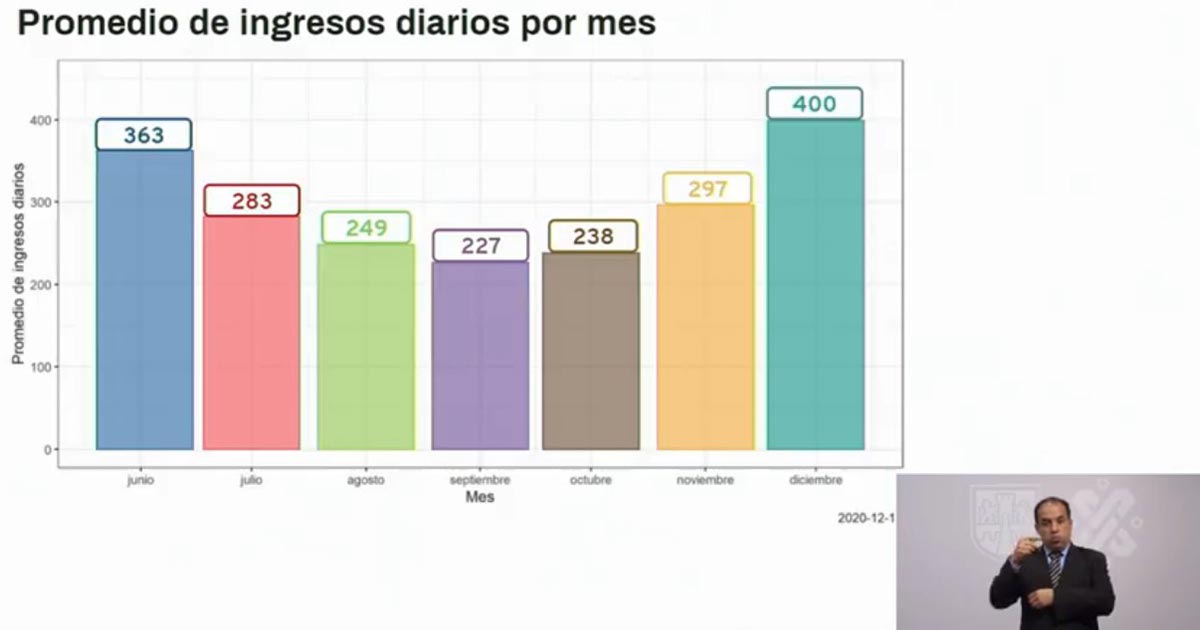 Sheinbaum argumentó que en la última semana se registraron prácticamente 400 ingresos diarios a hospitales y en esos días hubo 2 mil 893 hospitalizados más, con lo que suman 4 mil 454 pacientes internados en los nosocomios de la ciudad, equivalente al 74 por ciento de la ocupación de camas, de las cuales, 68 por ciento son generales y 62 con sistema de intubación.
