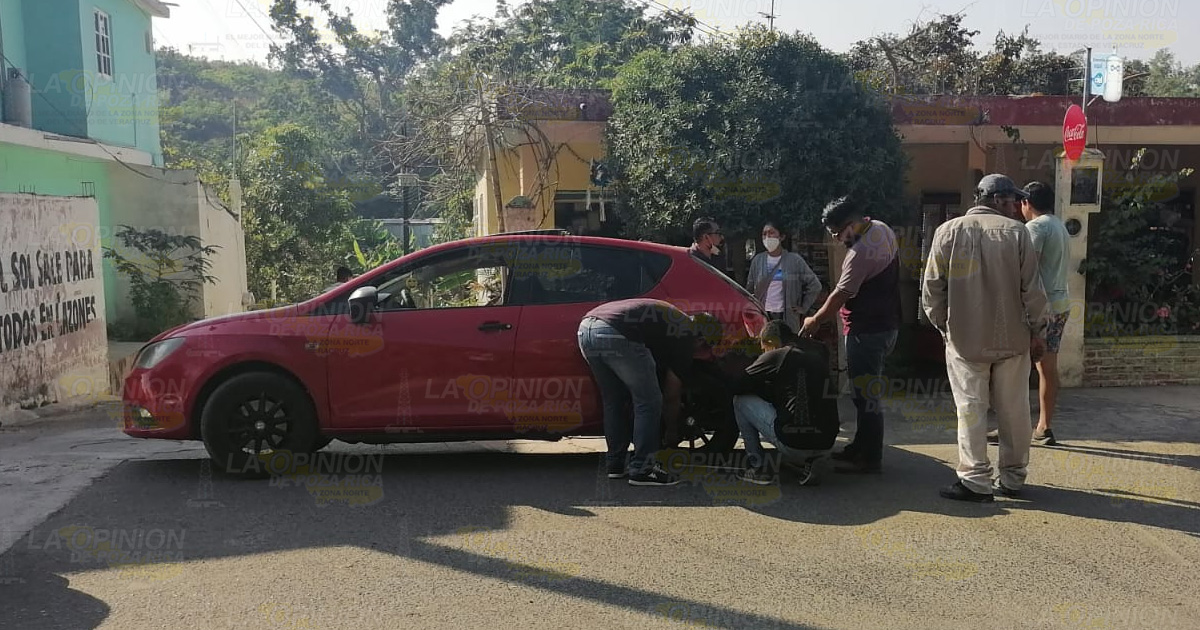 Al llegar justo donde se encuentra un tope, el conductor de una camioneta negra Jeep Grand Cherokee, impactó al Ibiza en la parte trasera, provocando que saliera disparado metros adelante, y que una jovencita y una mujer adulto mayor, sufrieran golpes en diversas partes del cuerpo, por lo que fueron subidas a otro vehículo particular y trasladados a una clínica de Poza Rica.