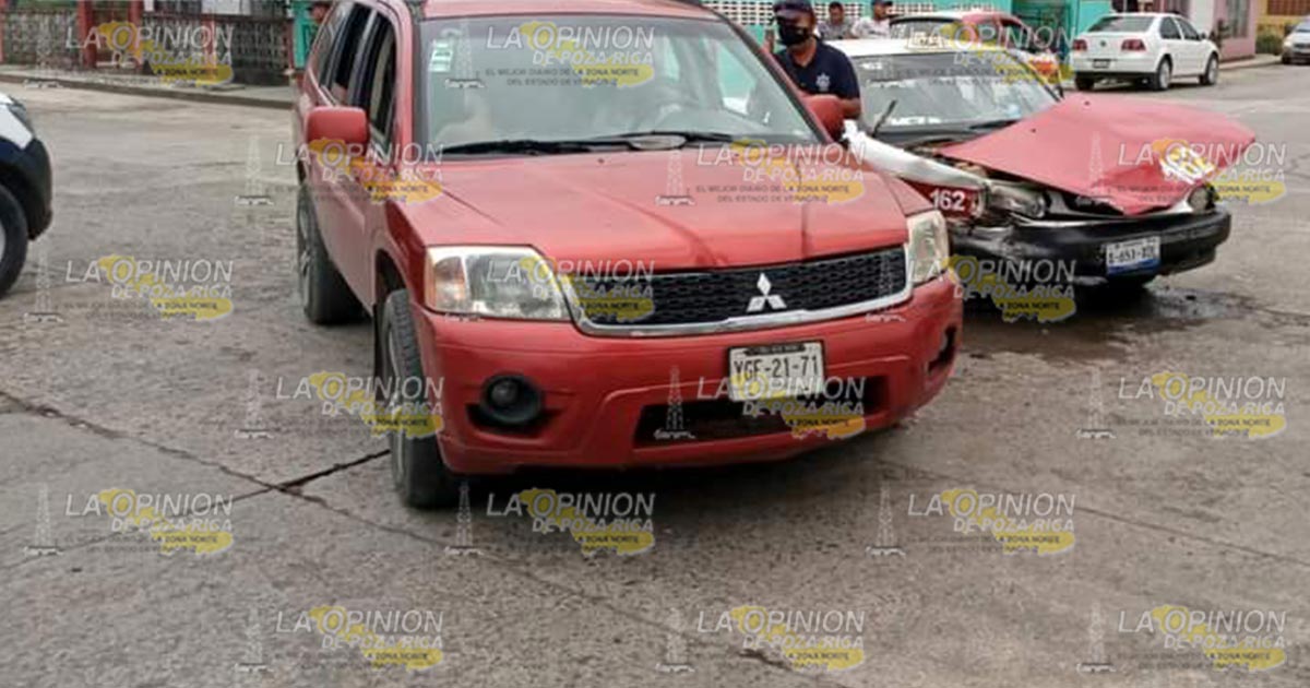 El accidente se registró en el crucero que forman las calles Reforma y Benito Juárez de la colonia Progreso de esta ciudad en el que se vieron involucrados un automóvil Tsuru marcado con el número económico 162 de la modalidad de taxi, con placas de circulación A-651-XDL del Estado de Veracruz, conducido por el señor Martin S.M., de 25 años de edad con domicilio en la colonia 16 de septiembre, la otra unidad es una camioneta Endeavor Mitsubishi color vino con matrícula YGF-21-71 del Estado Veracruz, tripulada por la señora Sugey B.S., de 40 años de edad, quien dijo vivir en la comunidad de kilómetro 22 del municipio de Chinampa de Gorostiza.