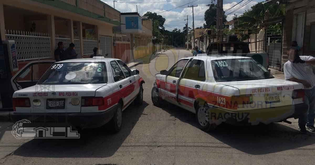 Poza Rica, Ver.- El fuerte choque se registró en la esquina de la avenida Papantla y 2 de abril de la colonia Manuel Ávila Camacho, fueron dos taxistas los protagonistas.