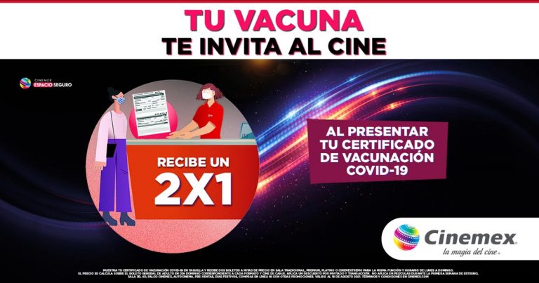 Ciudad de México.- La cadena de cines Cinemex arrancó el pasado jueves una singular promoción: Tu Vacuna te Invita al Cine, que ofrece entradas al 2×1 para quienes acudan con su comprobante de vacunación anti-COVID. En las bases se especifica que los boletos a mitad de precio para sala tradicional 2D, Premium, CinemeXtremo, Cinemex Platino … Sigue leyendo Cinemex ofrece 2×1 a vacunados