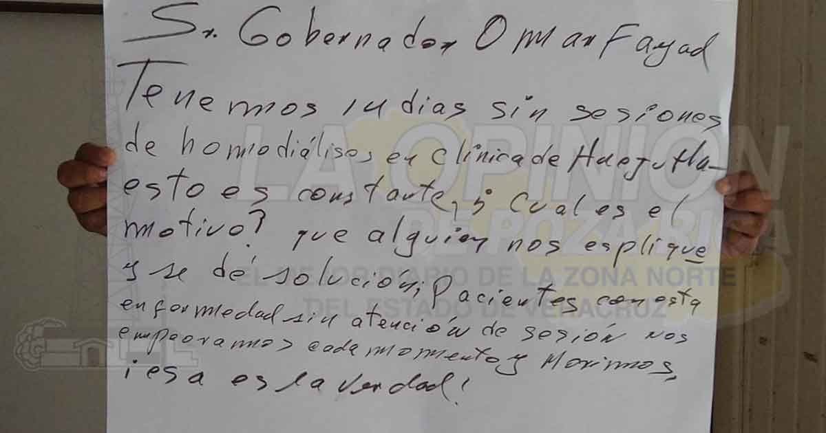 Con cartulinas en mano, los inconformes se entrevistaron con el titular de la Subsecretaría de Gobierno en la Huasteca, Gerardo Canales Valdez a quienes le expresaron su molestia sobre dicho hospital que se encuentra inoperante y al mismo tiempo, exigir que el servicio de esta clínica, ubicado sobre la vía estatal Huejutla-Chalahuiyapa, se reactive inmediatamente para atender a los pacientes que se encuentran en riesgo latente de muerte al no recibir sus sesiones como corresponde.