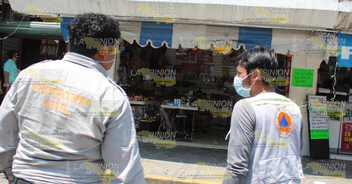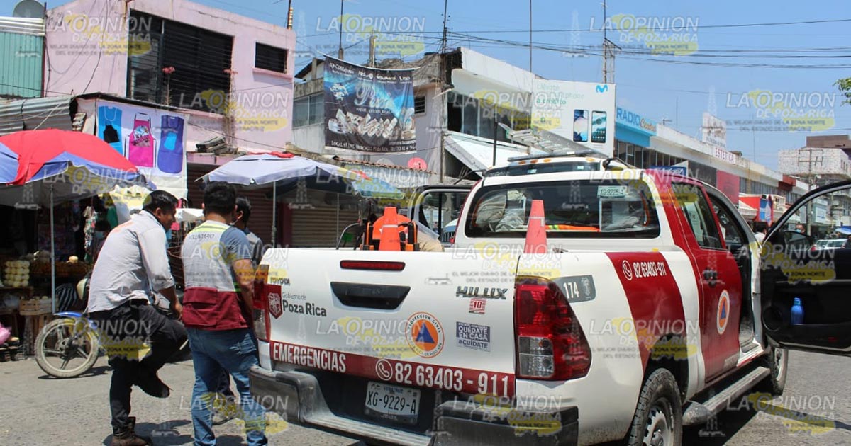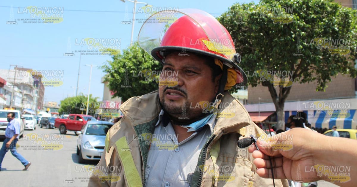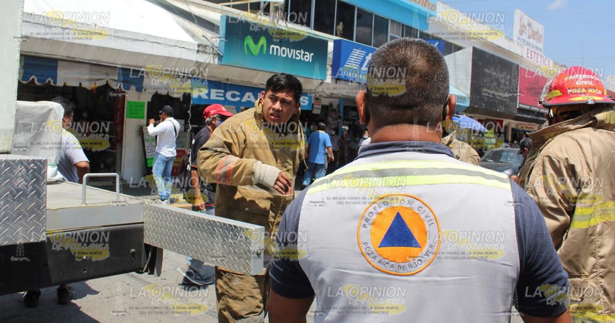Poza Rica, Ver.- Comerciantes establecidos y ambulantes del Mercado Poza Rica, fueron sorprendidos a mediodía de este martes 6 de abril, con un conato de incendio que sucedió en un local sobre la Avenida Kehoe Vincent, dónde al parecer un corto circuito fue el culpable de este movimiento en el primer cuadro de la ciudad, así lo dio a conocer el comandante en jefe del cuerpo de bomberos Luis Ramos.
