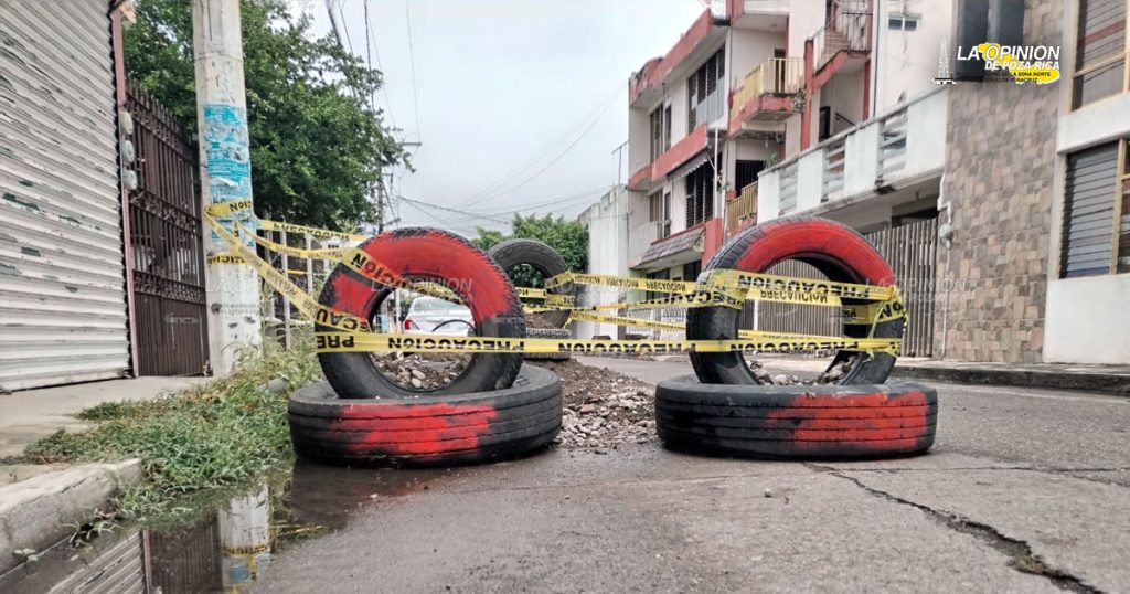 Personal del ayuntamiento procedió a colocar cinta de “Precaución” apoyada en seis llantas en forma de triángulo, pero los vecinos piden que se proceda a rehabilitar el tramo, ya que debajo del pavimento la tierra se ha reblandecido con las lluvias y se está socavando cada vez más.