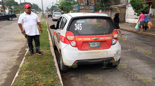 En este sitio el taxi número económico 345, con placas de circulación A588XDE del Estado, manejado por Miguel Ángel Cuevas Castillo, vecino de la colonia Vicente Guerrero, de esta ciudad fue impactado por alcance por otro vehículo.