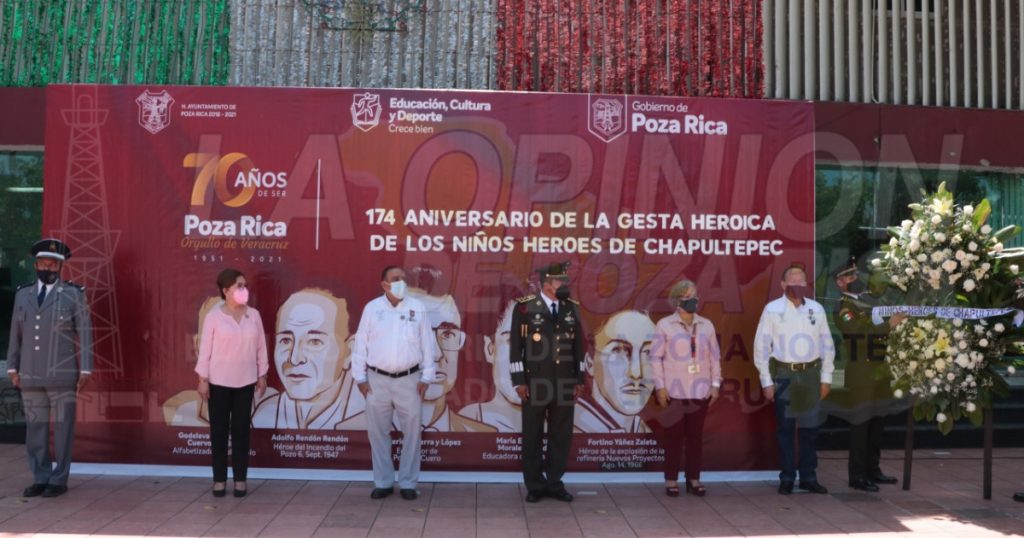 Poza Rica, Ver.- “La máxima representación del patriotismo en México nos la han legado nuestras juventudes” expresó el alcalde Francisco Javier Velázquez Vallejo, en el marco de la Conmemoración del 174 Aniversario de la Gesta Heroica de los Niños Héroes de Chapultepec, celebrada este lunes en la explanada municipal, en donde la primera autoridad estuvo acompañado del Coronel de Infantería Diplomado de Estado Mayor, Vicente Dimayuga Canales, Comandante del 7mo. Batallón de Infantería, así como ediles de la presente gestión municipal.