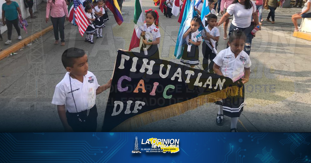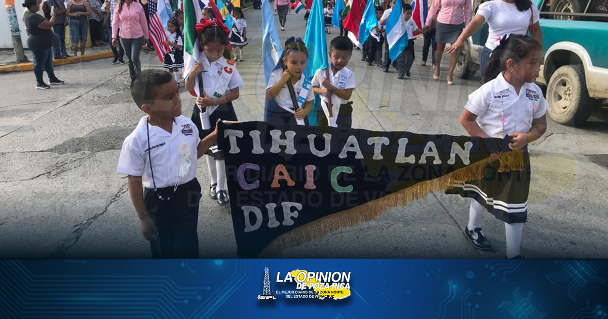 Encabezados por la banda de guerra de la escuela secundaria general Cuauhtémoc, en el contingente estuvieron los niños del Centro de Atención Infantil Comunitario (CAIC) Tihuatlán en sus dos turnos, Juana de Arco, Rosaura Zapata Francisca García Battle, Diego Rivera, María Pape Carpentier,José Revueltas y Diego Rivera.
