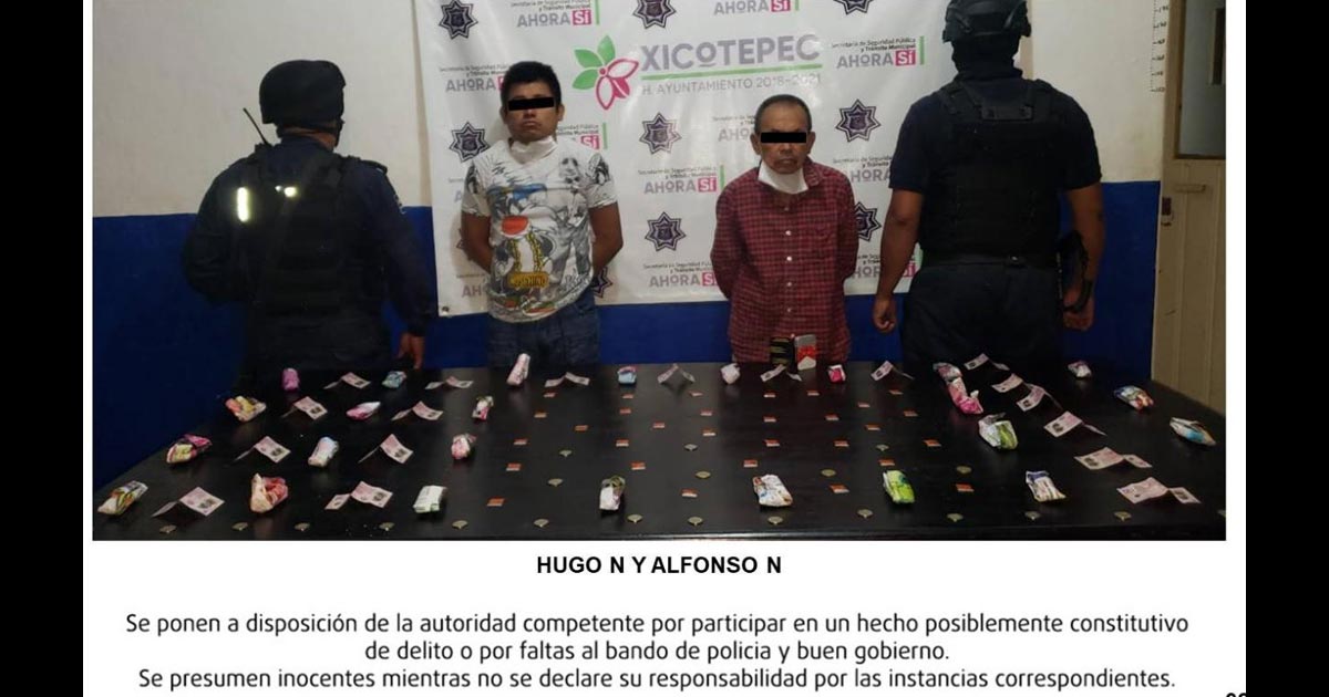 Los elementos de la SSPTM aprehendieron a los dos sujetos en inmediaciones de la colonia Los Manguitos, donde presuntamente se encontraban vendiendo dichas sustancias y quienes luego de intentar darse a la fuga fueron inspeccionados, hallando entre sus posesiones las posibles drogas, así como dinero en efectivo.