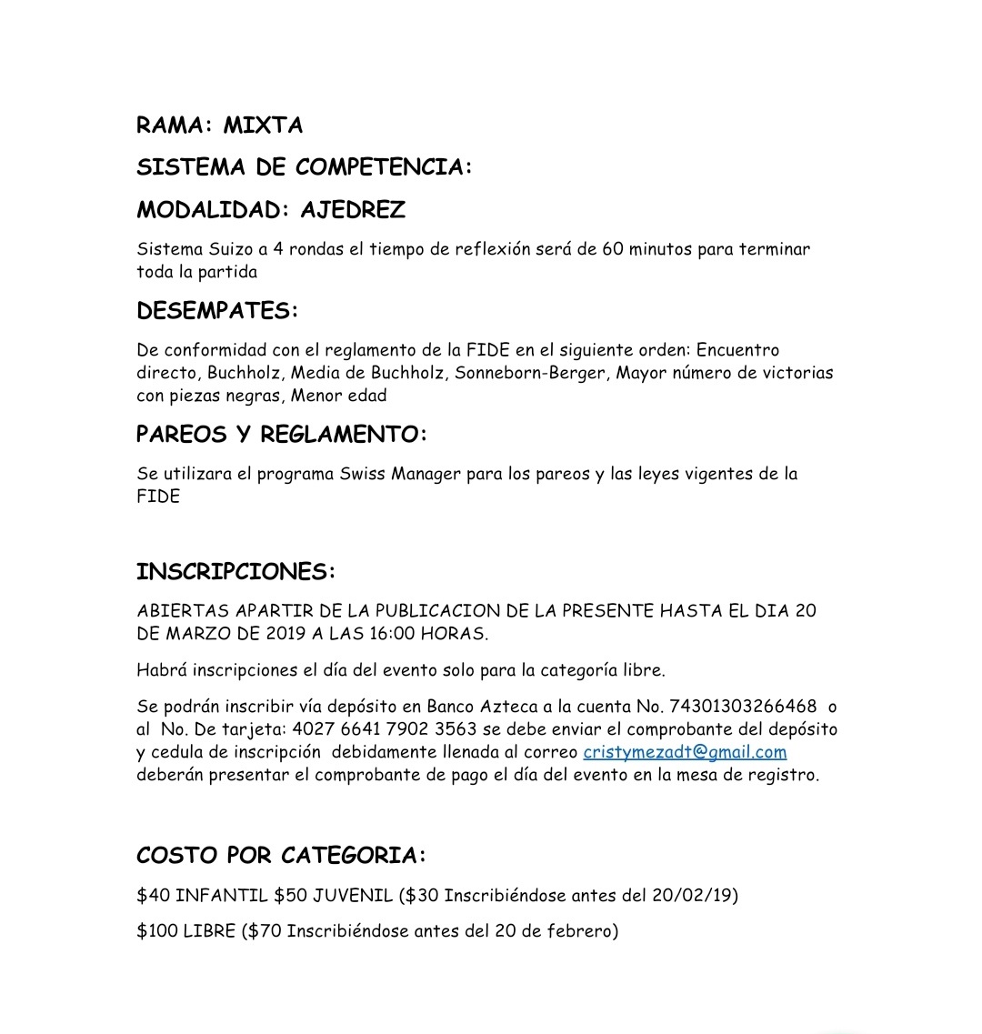 El torneo se llevará a cabo el día 23 de marzo del presente año, las categorías serán infantil 2007 – 2010, juvenil 2003 – 2006 y la categoría libre.