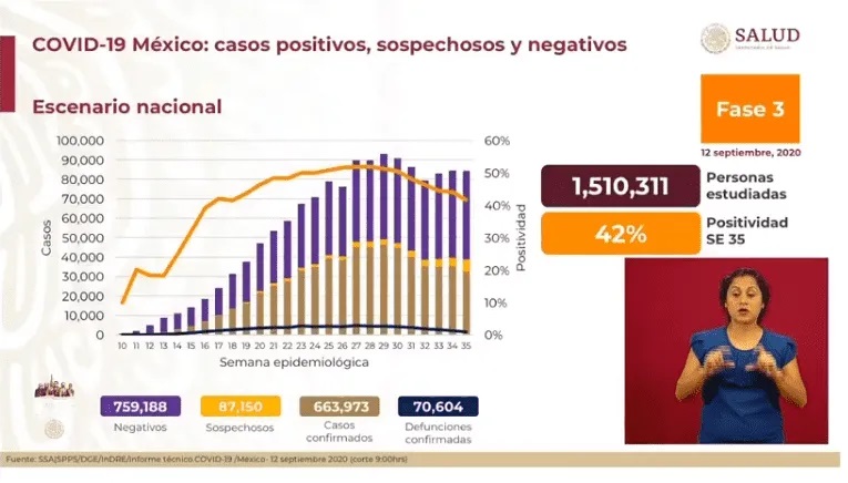 CDMX.- Este sábado, la Secretaría de Salud Federal reportó 421 muertes y 5 mil 674 contagios nuevos al cierre de la semana 37 de la contingencia en el informe diario más reciente.
