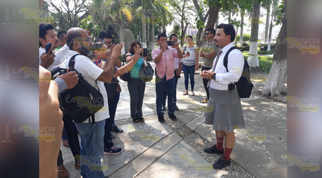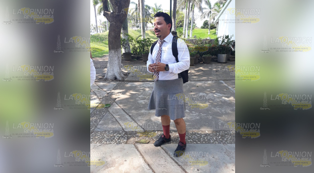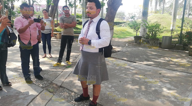 Corbata, manga larga… y falda gris. Con polémico guardarropa el alumno Alejandro Sotero de la Facultad de Derecho (Sistema Abierto) acudió a sus clases sabatinas en el Campus Coatzacoalcos de la Universidad Veracruzana.