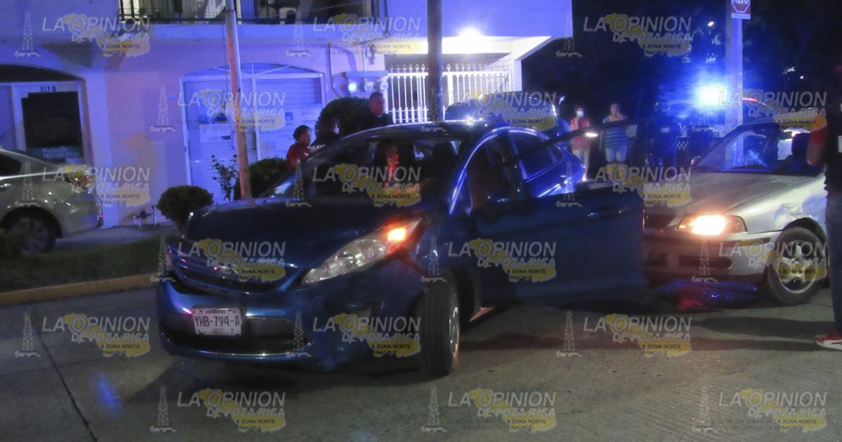 Poza Rica, Ver.- A las 10:15 de la noche, de este domingo 19 de septiembre, un fuerte impacto dejó un par de vehículos con cuantiosos daños materiales, así como una fémina lesionada, al lugar arribaron paramédicos de Samuv, quienes atendieron a los conductores participantes tras el choque.