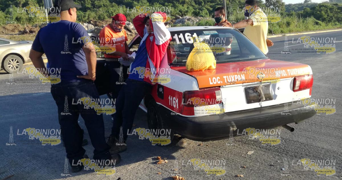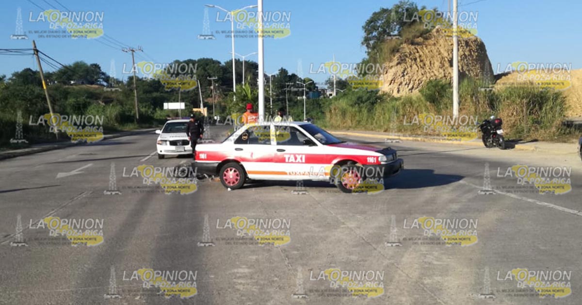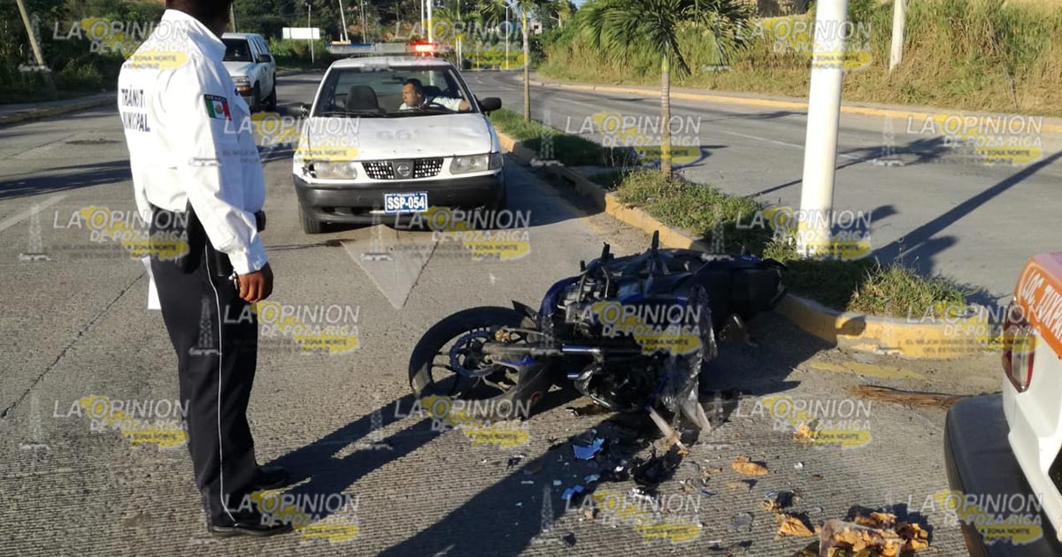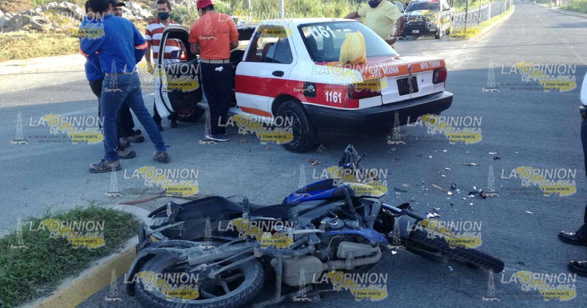 Tuxpan, Ver.- Motociclista resultó con una herida en la cabeza al chocar con un taxi cuyo conductor daba una vuelta en U en el libramiento Adolfo López Mateos; autoridades de vialidad aseguraron las unidades y al ruletero trasladándolos a sus oficinas.