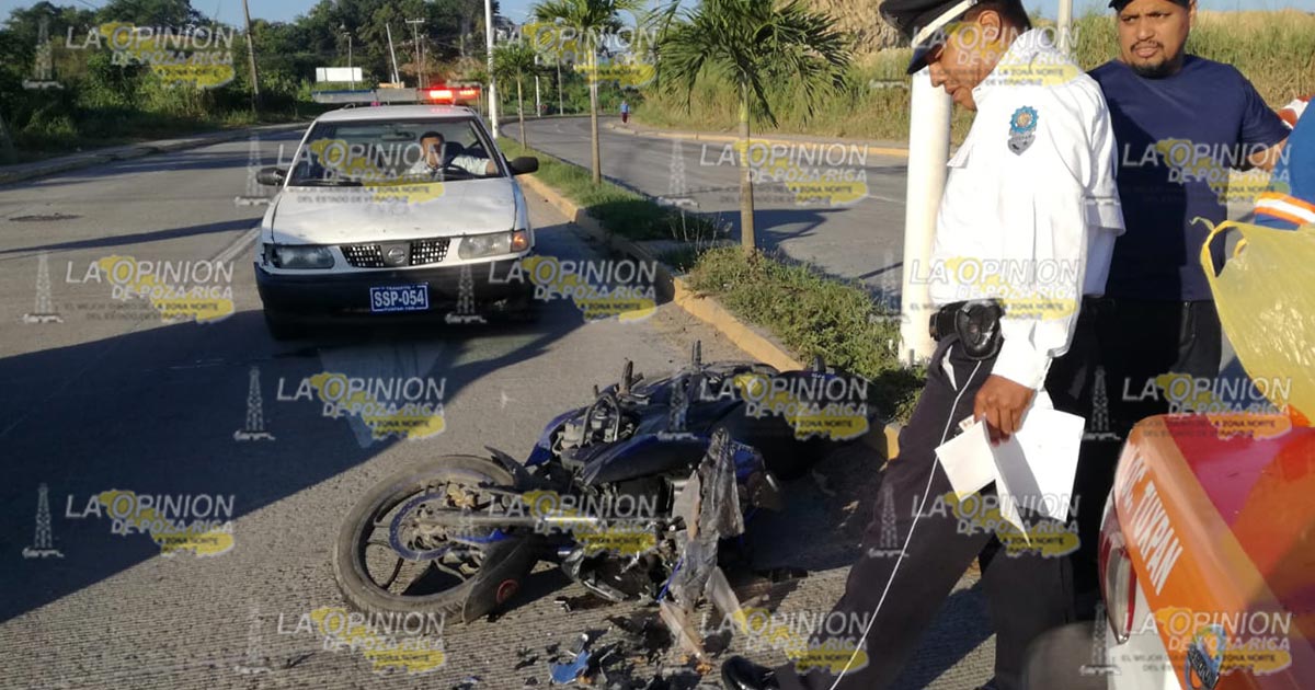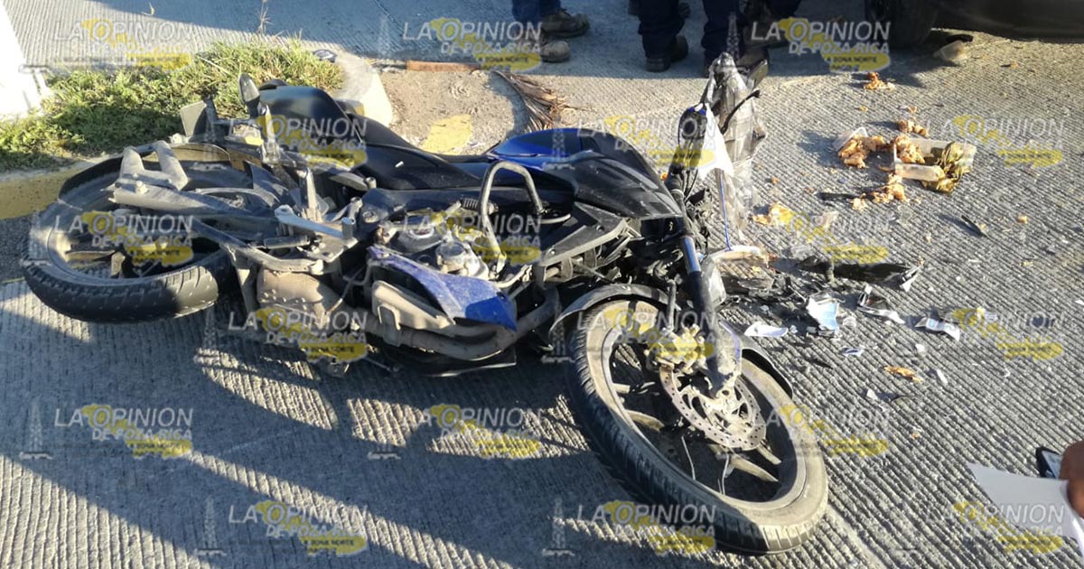 Dicho sujeto manejaba una motocicleta Pulsar c160, sin placas de circulación y se impactó en el costado izquierdo del taxi número económico 1161, matrícula A540XEK del Estado, manejado por Alejandro Eligio Alejandre, de 53 años, con domicilio en la colonia Las Granjas, de esta localidad.
