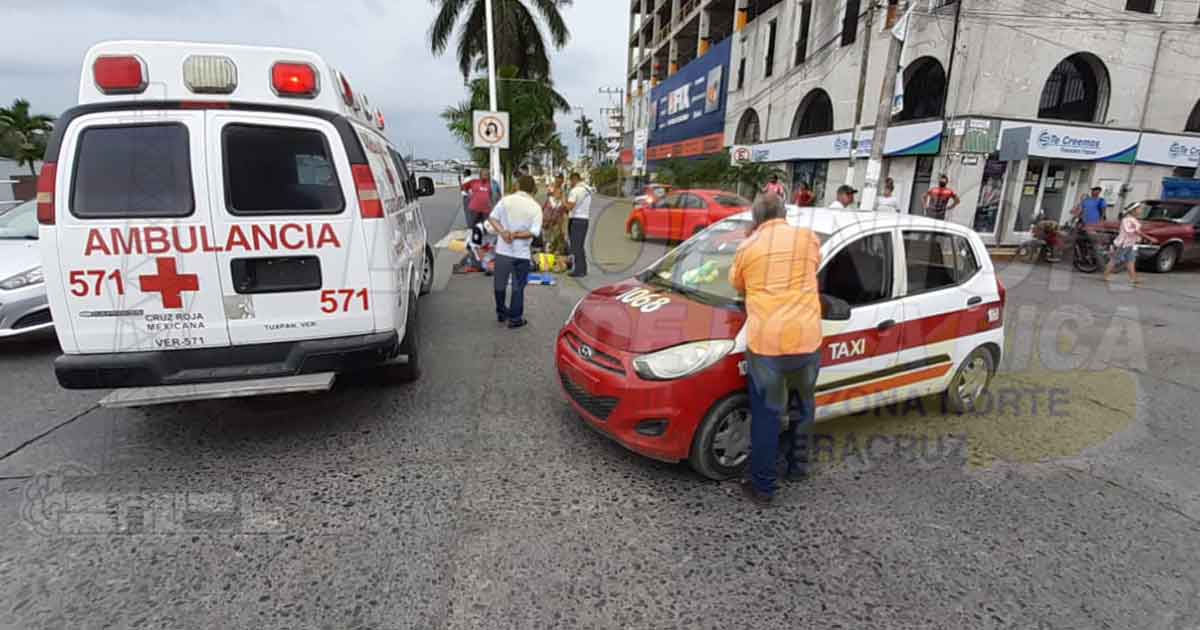 Tuxpan, Ver.- Joven que manejaba una motocicleta fue impactado por un taxi resultó con diversas contusiones en el cuerpo por lo que tuvo que ser trasladado a la clínica del IMSS para su atención médica, elementos de Tránsito aseguraron al responsable.