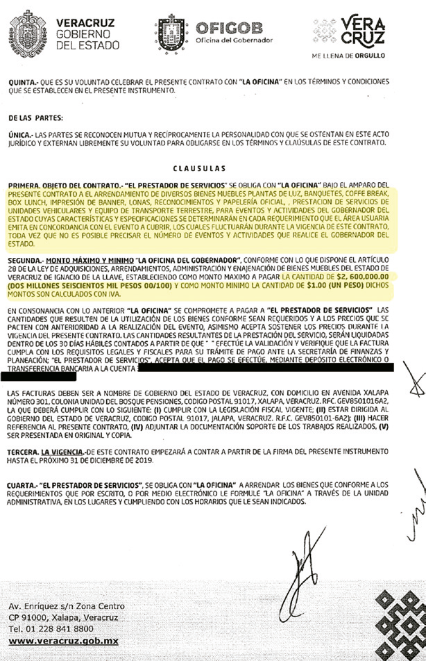 Dicho convenio aplicó a partir del 28 de marzo al 31 de diciembre de 2019, y ampara por igual la compra de alimentos, la renta de vehículos y todo lo relacionado con la logística de los eventos públicos y privados del gobernador Cuitláhuac García Jiménez.