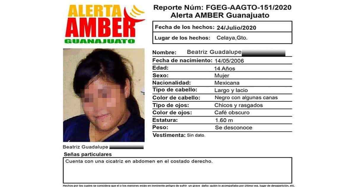 Se trata de Beatriz Guadalupe Escoto Pérez, de 14 años, quien de acuerdo con el número de reporte FG-EG-AAGTO-151/2020 de Alerta Ámber Guanajuato salió de su domicilio el 24 de Julio del presente año aproximadamente a las 15:30 horas y por su minoría de edad se temía por su integridad pues podría haber sido víctima de algún delito.