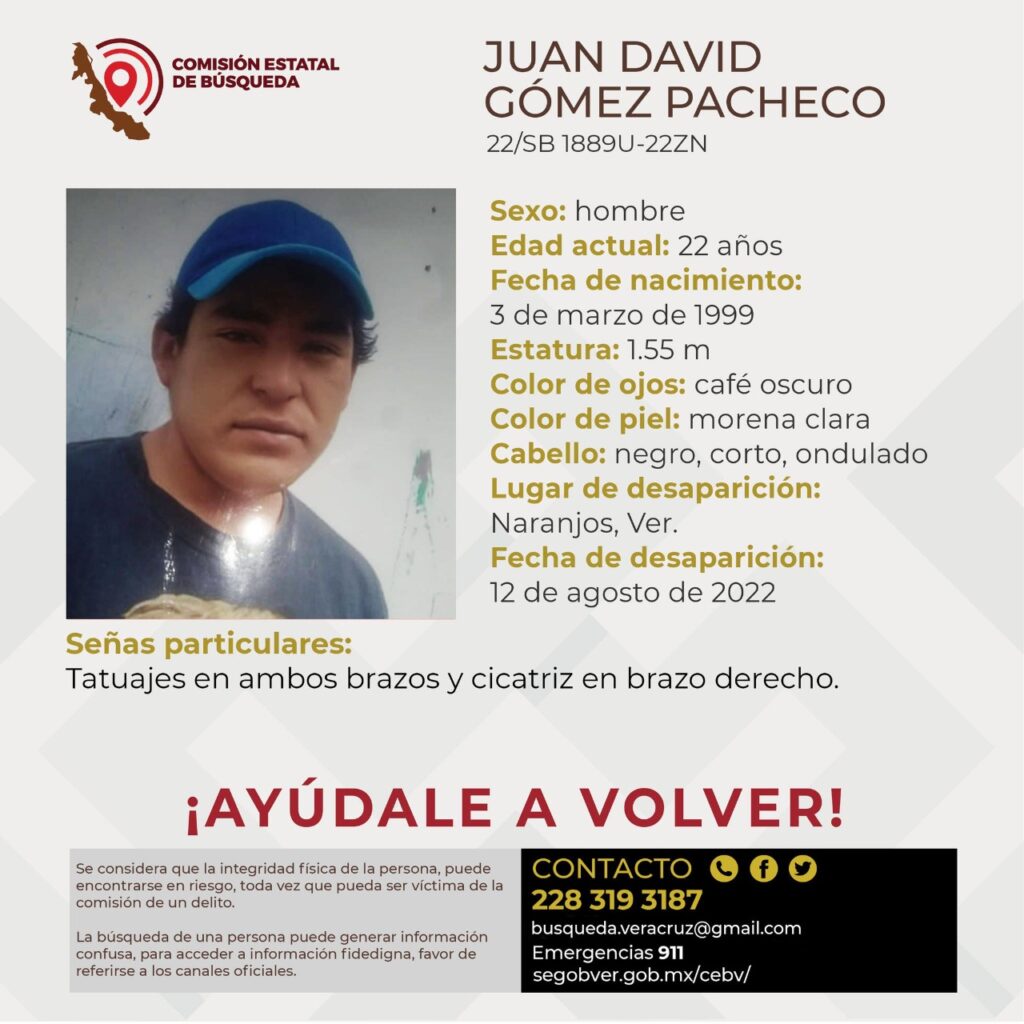 NARANJOS, VER.- Un joven ciudadano de este municipio fue reportado por su familia como desaparecido, luego de que desde el 12 de agosto de este año fue visto por última vez.
