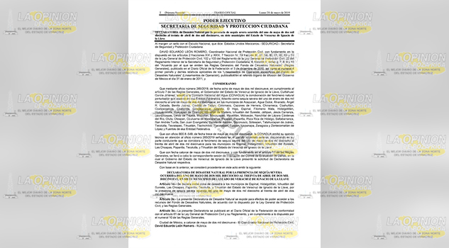 Lo anterior fue publicado en el Diario Oficial de la Federación donde señala que fueron declarados como zona de desastre los municipios de Espinal, Hidalgotitlán, Ixhuatlán del Sureste, Las Choapas, Papantla, Tecolutla, y Tihuatlán, por la presencia de sequía.