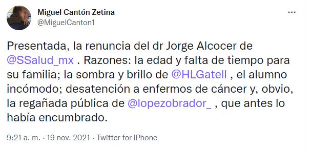 “Para quienes les preocupan los rumores falsos sobre su renuncia”, señaló en el mensaje, poniendo fin al rumor que comenzó Miguel Cantón Zetina en la misma red social.